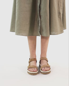 Wedge sandals. Natural suede. Velcro Closure. Leather lining. Anatomical insole. Flexible and durable Polyurethane sole. Heel height: 7.25 cm. 100% Made in Spain.
