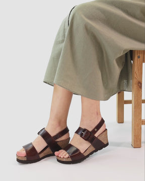 Wedge sandals. Leather Pull-Up. Velcro Closure. Leather lining. Anatomical insole. Lightweight, flexible, strong cork and EVA rubber sole. Heel height: 6.5 cm. 100% Made in Spain.